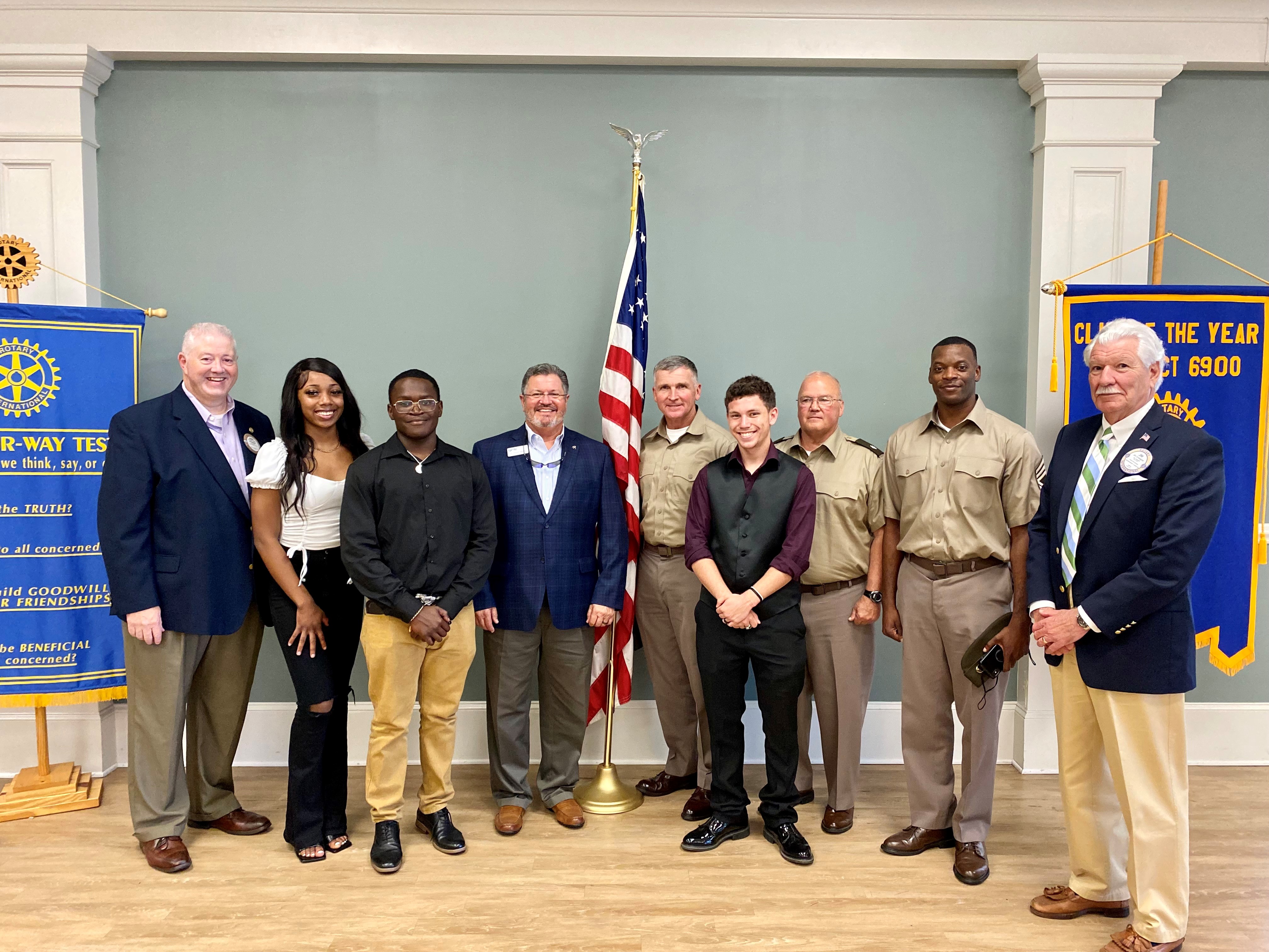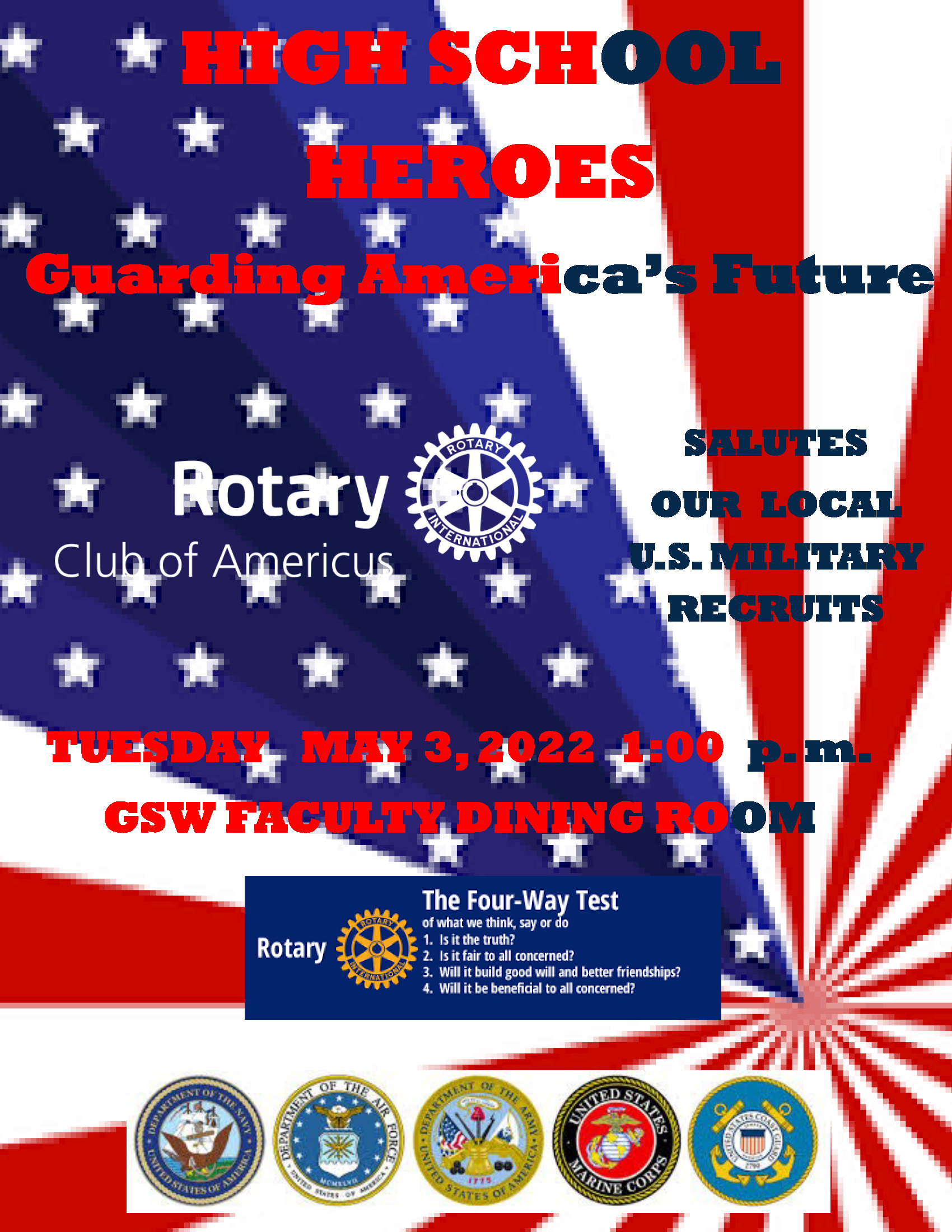 Honoring high school students who have committed to military service. These students have to have completed paperwork with one of the branches of US military service. The students are recognized at a luncheon in their honor and are given duffle bags (embroidered with club logo) containing a Four Way Test coin in the pocket. Rotarians who are veterans lead the program designed to honor, empower, and encourage students who have made such a commitment.