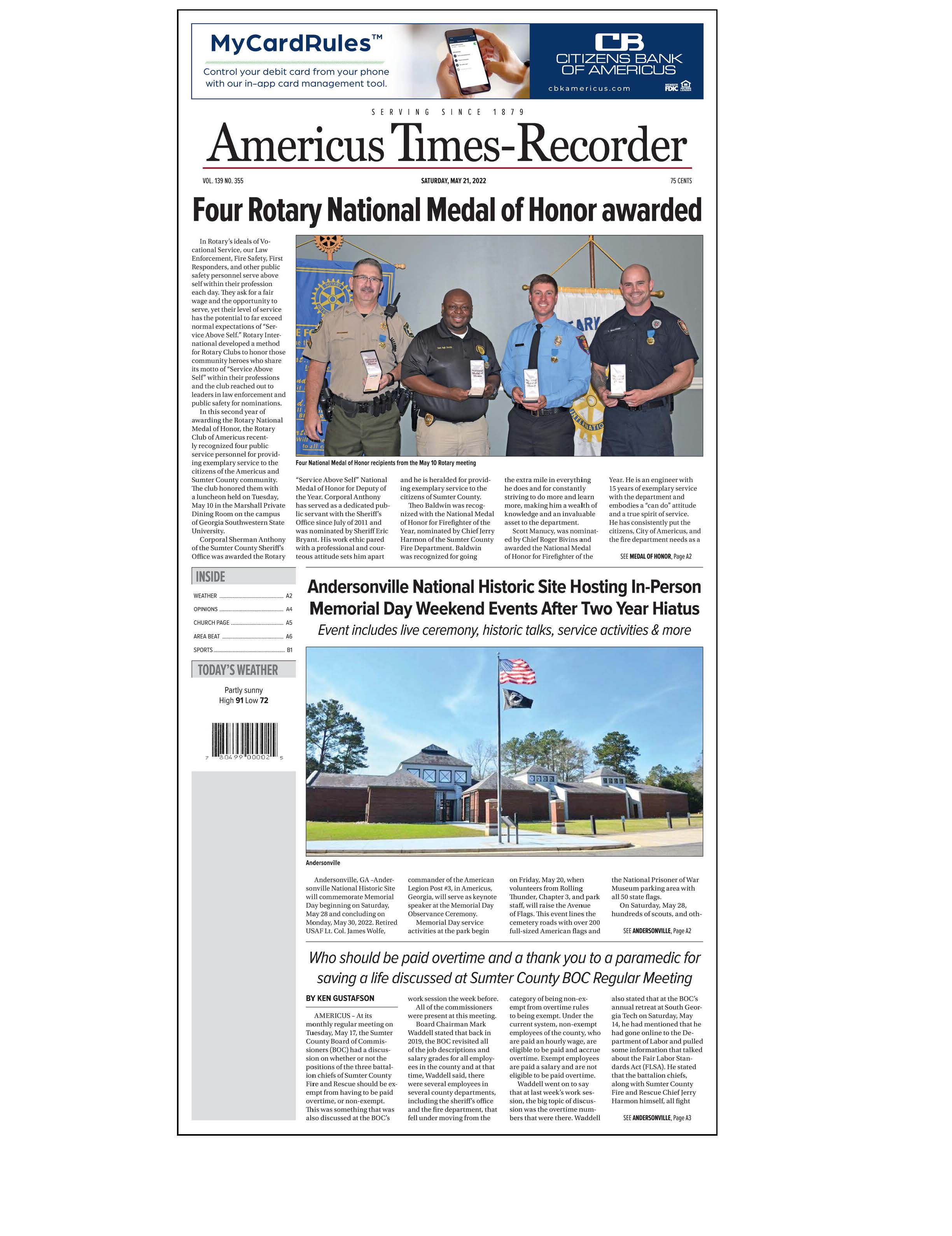 In this second year of awarding the Rotary National Medal of Honor, the Rotary Club of Americus recently recognized four public service personnel for providing exemplary service to the citizens of the Americus and Sumter County community. The club honored them with a luncheon held on Tuesday, May 10 in the Marshall Private Dining Room on the campus of Georgia Southwestern State University. The 2022 recipients of the National Medal of Honor were Corporal Sherman Anthony (Deputy of the Year), Detective sergeant Cedric Smith (Police Officer of the Year), Engineer Scott Manucy (Firefighter of the Year-Americus), and Firefighter Theo Baldwin (Firefighter of the Year-Sumter County).
