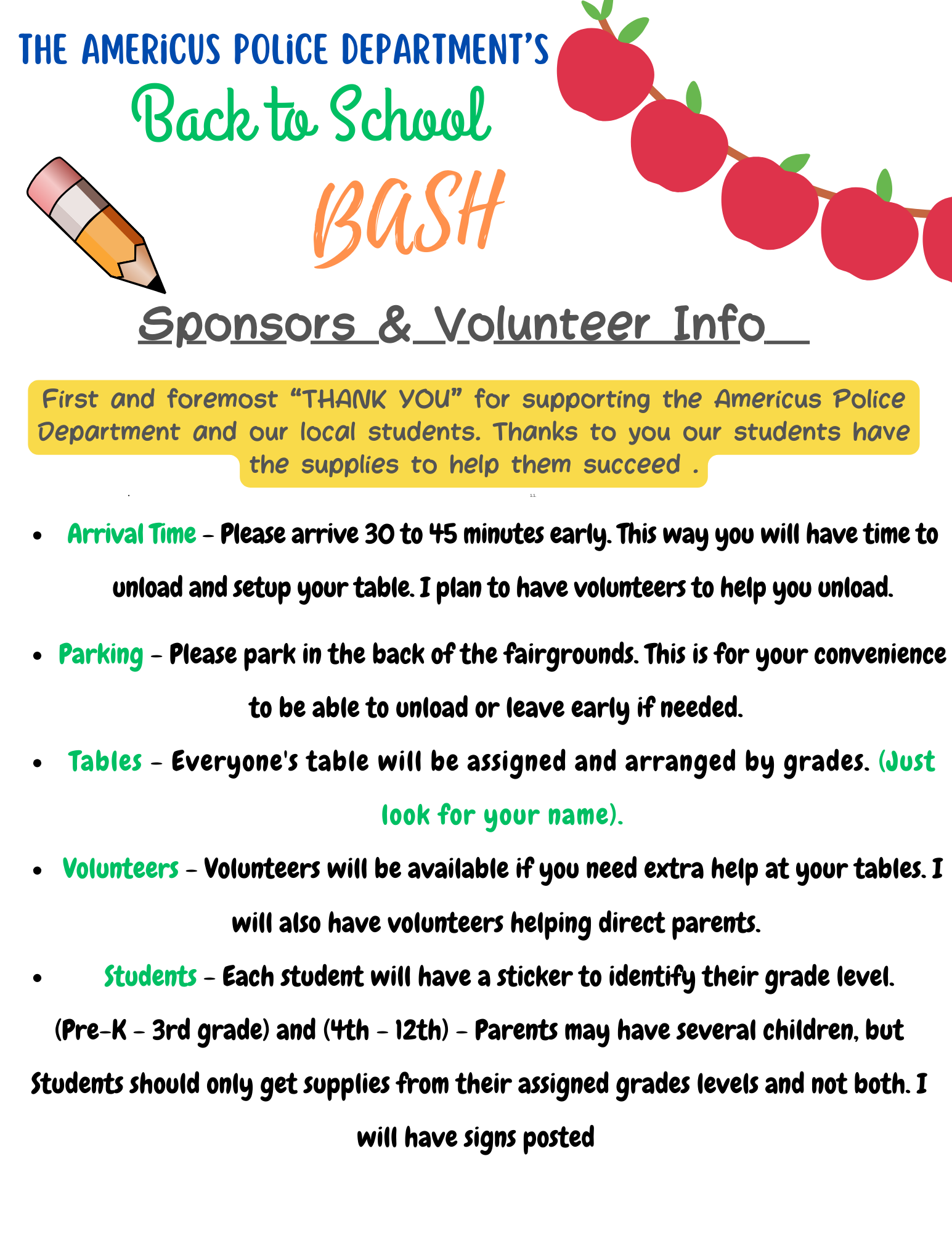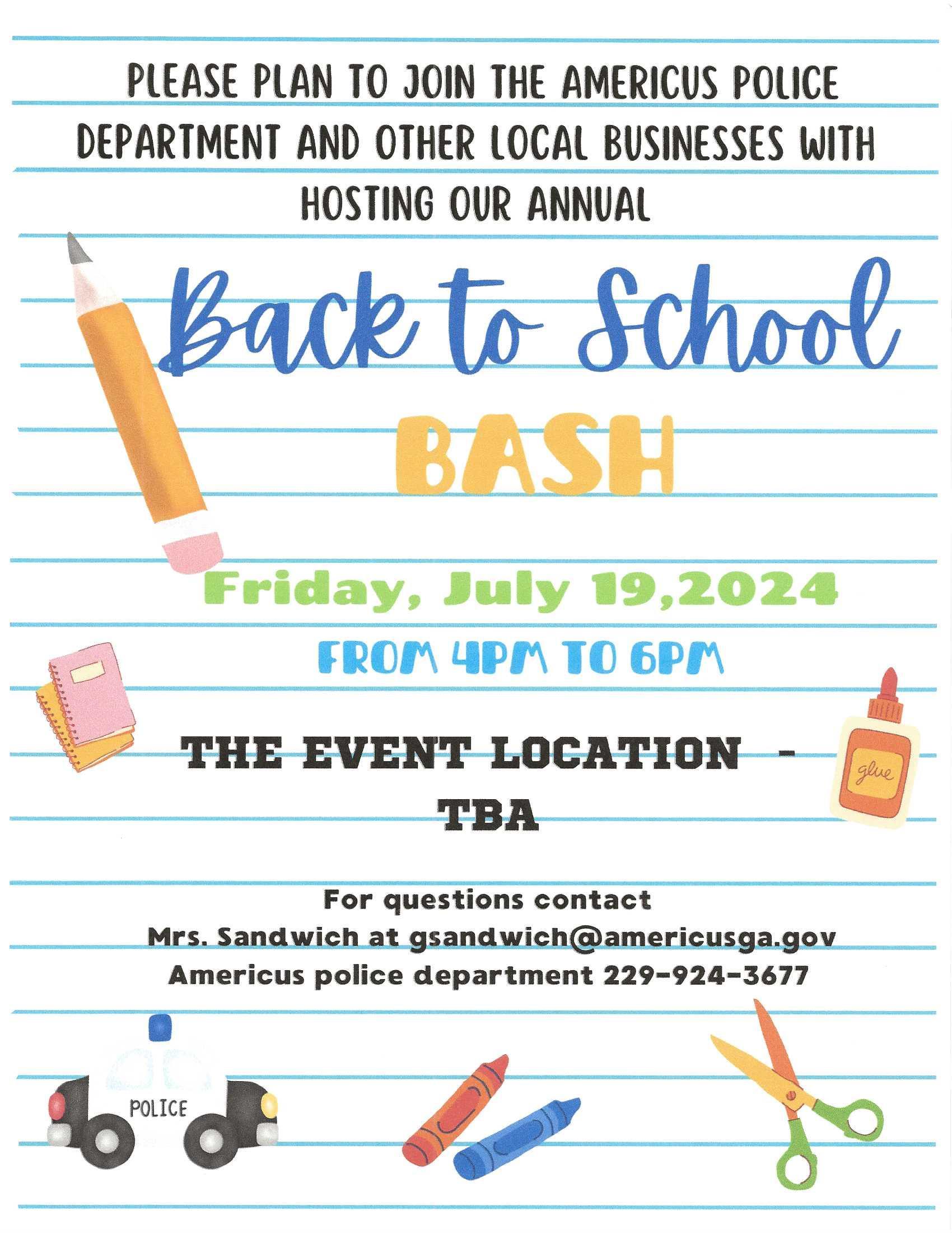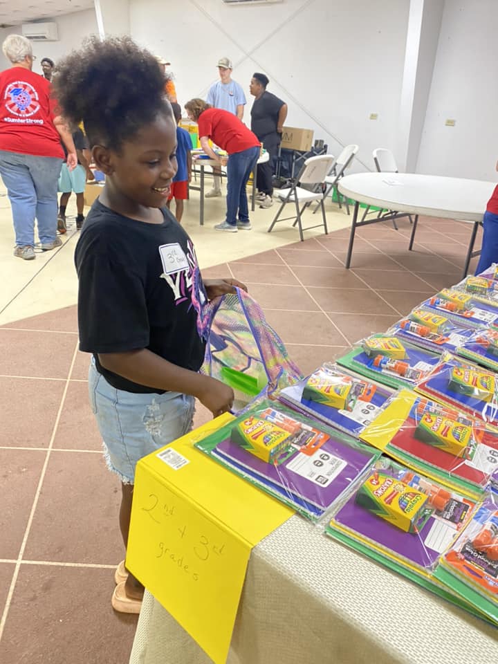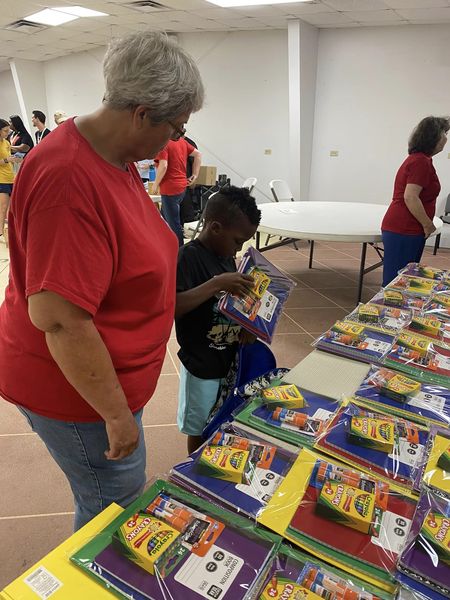 Rotary Club of Americus joined forces with other area organizations, non-profits and churches to give out free school supplies to children in our community. The event was coordinated by the Americus Police Department (APD Chief is a Rotarian) and eliminated duplication of services, ensuring that more children got needed supplies. Americus Rotarians gave out 100 packets to 2nd and 3rd grade students with supplies off of their list which included 3-pronged folders, composition books, 24 pack of crayons and pack of glue sticks. We also included a flyer which talked about the 4-way test. See attached for example.