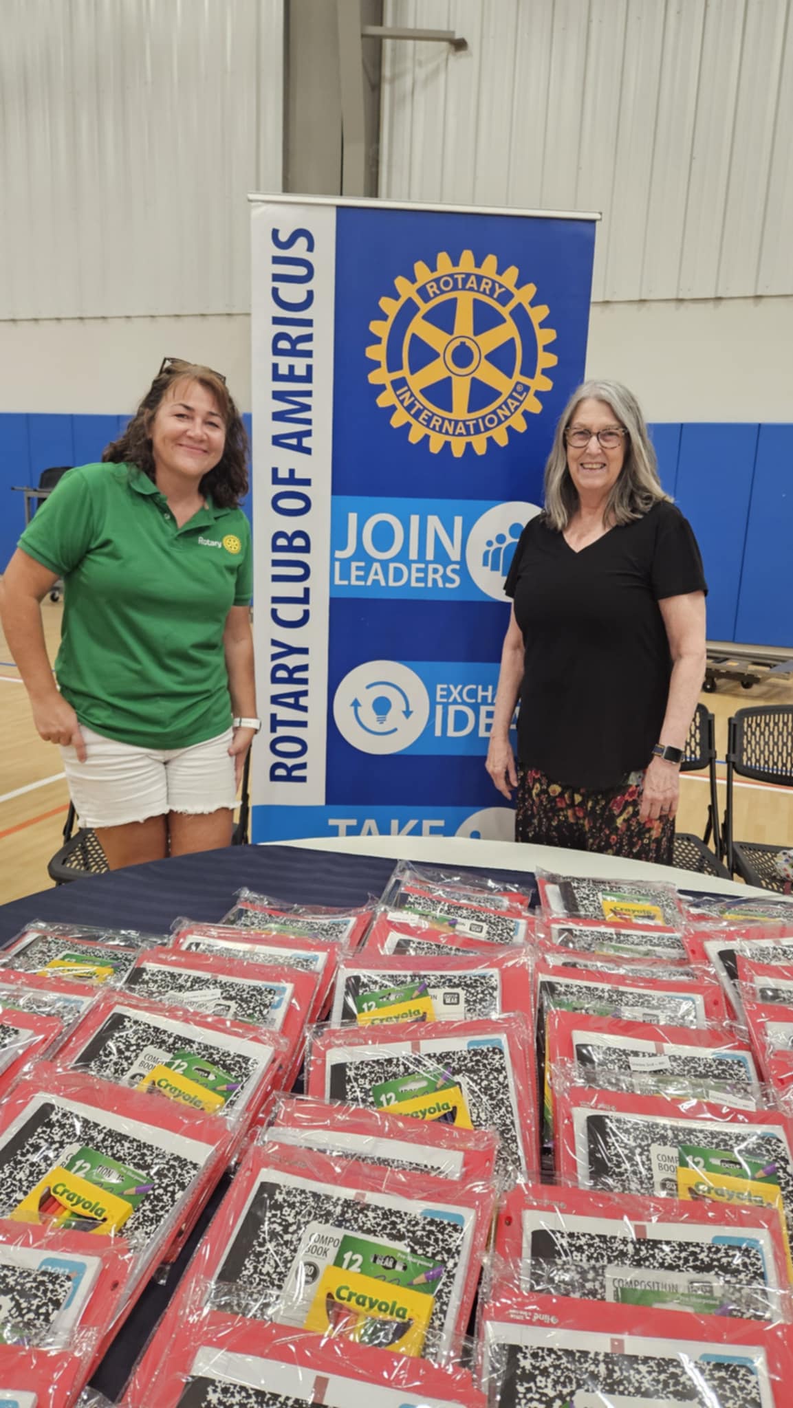 Rotarians assembled 100 clear packets with folder, notebook paper, composition book, colored pencils, a message from the club, along with the four-way test challenge. School supplies were procured off the supply list for grades 2nd through 12th.