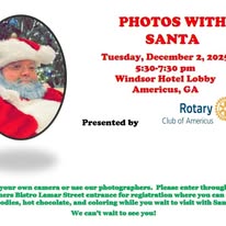 Each year, the Rotary Club of Americus sponsors free photos with Santa, offering families in our area are treated to cookies, snacks and hot chocolate (and activities for the children), along with an opportunity to get professional photos with the jolly man himself. The event is hosted in the historic Windsor Hotel in downtown Americus where Santa visits with children in the lobby.