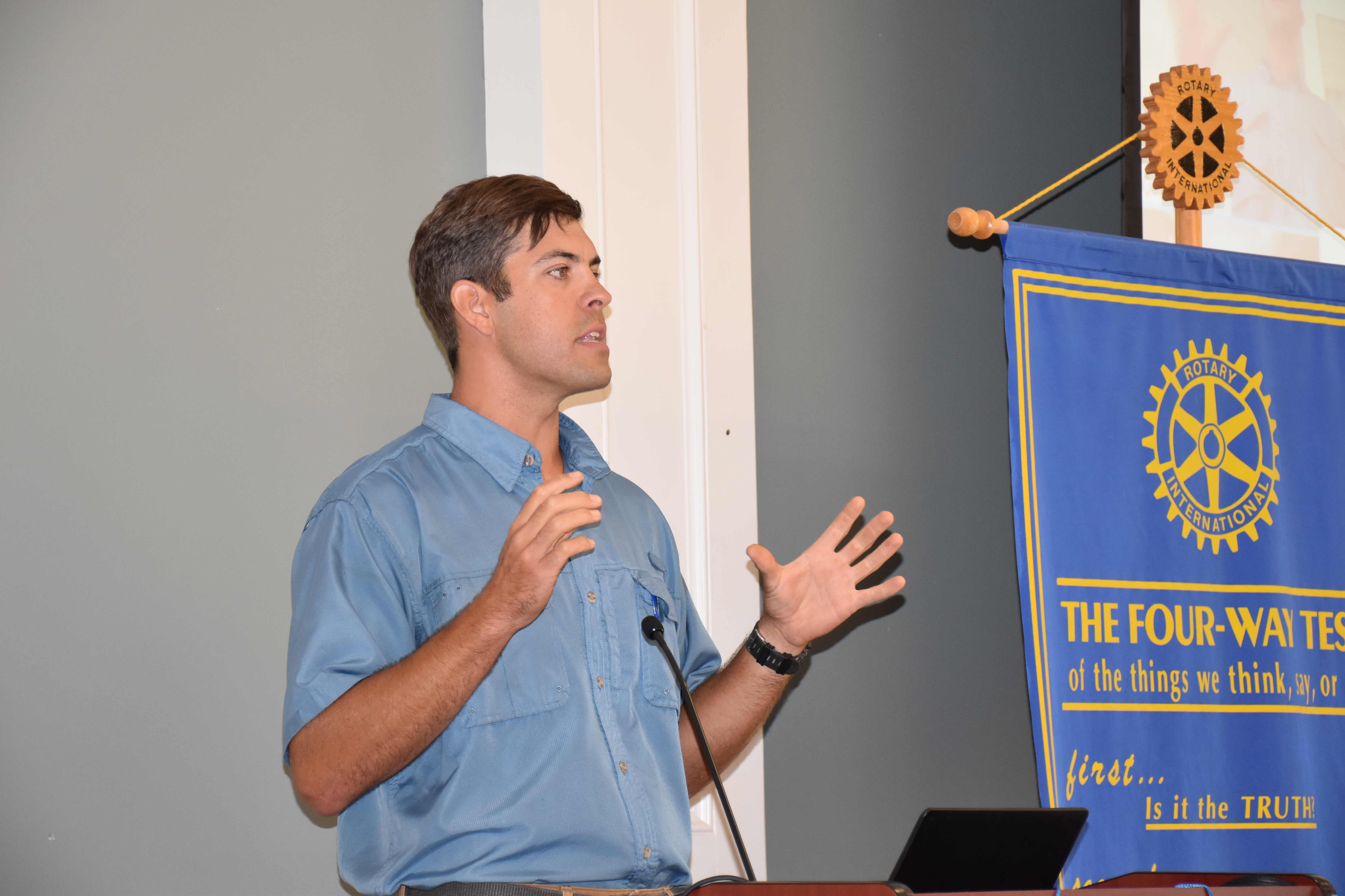 Jess McNeill addressed the Rotary Club of Americus recently to talk about how he is changing the way he farms using biological agriculture. After graduating with his bachelor’s and master’s degrees from UGA, he returned home to farm the same land as his family had for seven generations. It wasn’t long before he realized that they were producing the same kind of cotton that his great grandfather had with similar yields; however, the difference was evidenced in the margins as the cost to produce (equipment, gas, fertilizer and irrigation) was much higher than seventy years ago. “While the last fifty years in agriculture have seen vast improvements in technologies (mechanical, seeds, chemistries, and other advances), one thing we have forgotten as we ramped up production and that’s the land,” remarked McNeill. “While we have made huge strides in chemistries and seed treatments, we have taken the soil for granted and yields have plateaued.”