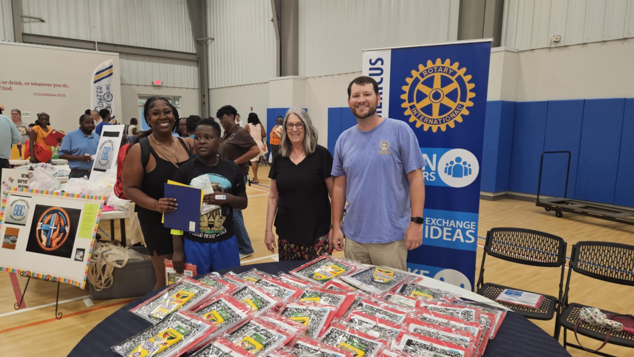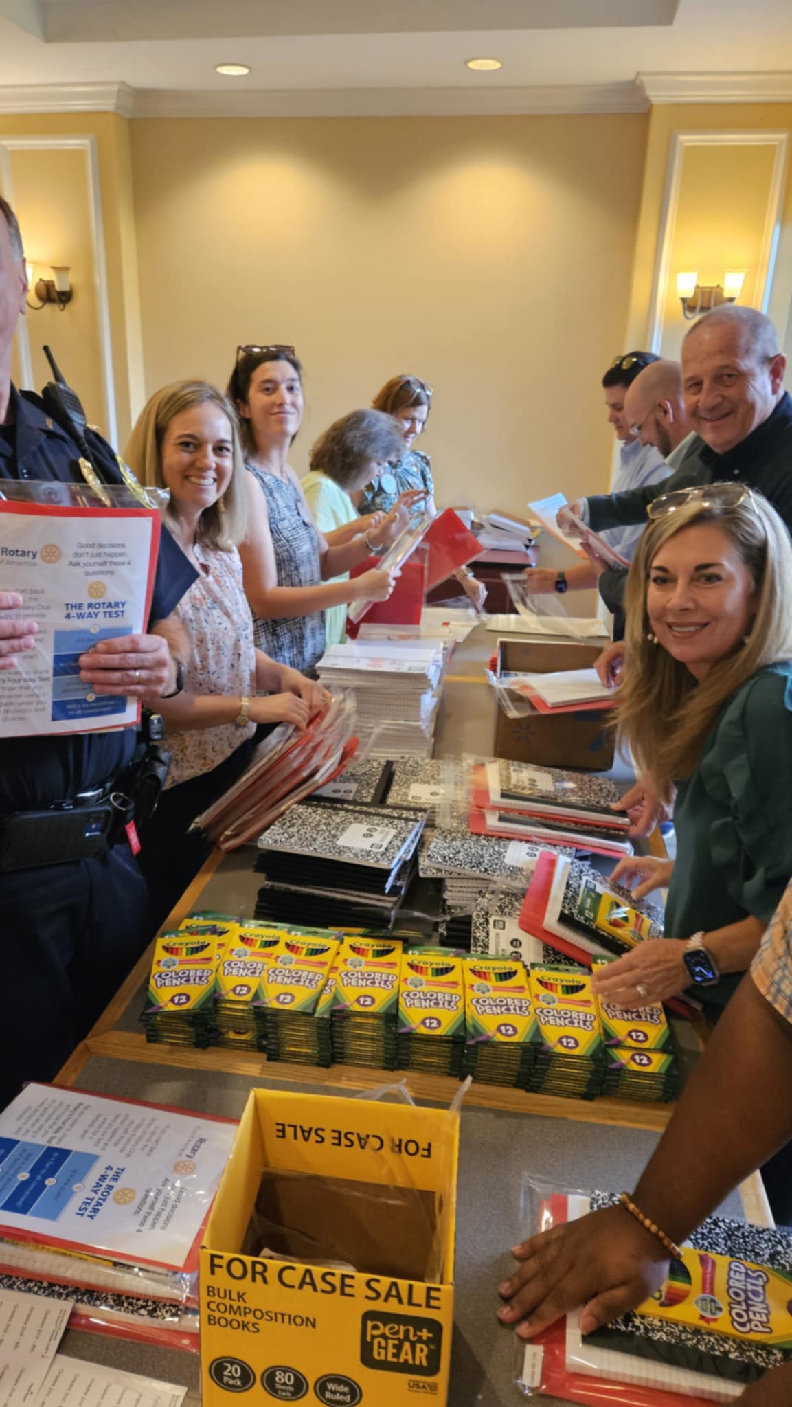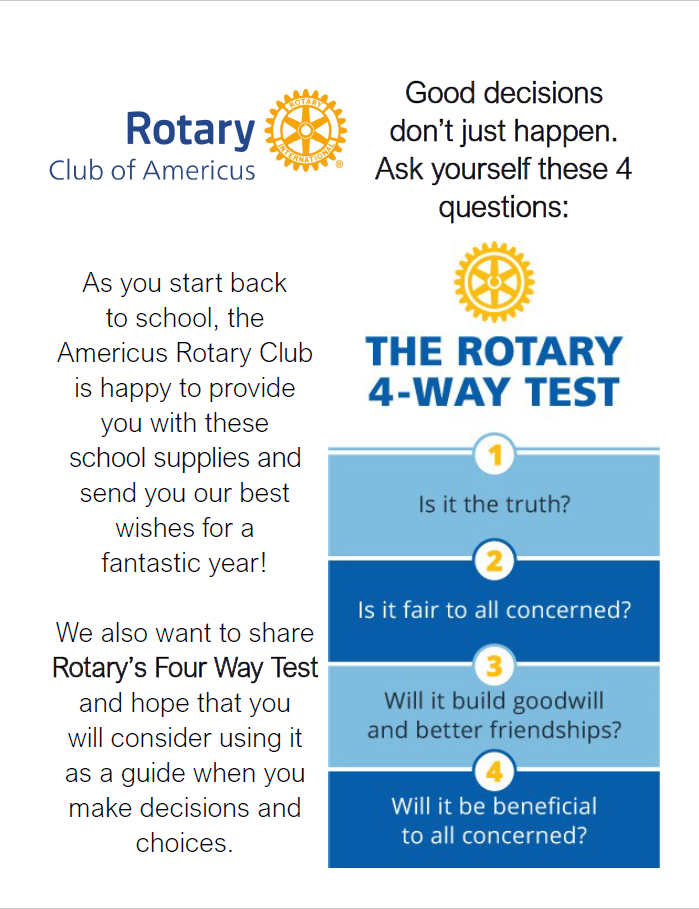 Rotarians assembled 100 clear packets with folder, notebook paper, composition book, colored pencils, a message from the club, along with the four-way test challenge. School supplies were procured off the supply list for grades 2nd through 12th.